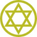 Ein "Hexagramm" in einem Kreis (auch David- und Judenstern genannt) z.B. zwei inneinander geschachtelte Dreiecke (siehe Grafik, aber den Kreis mit den Spitzen des